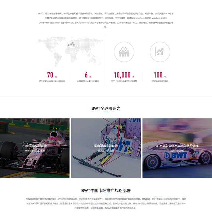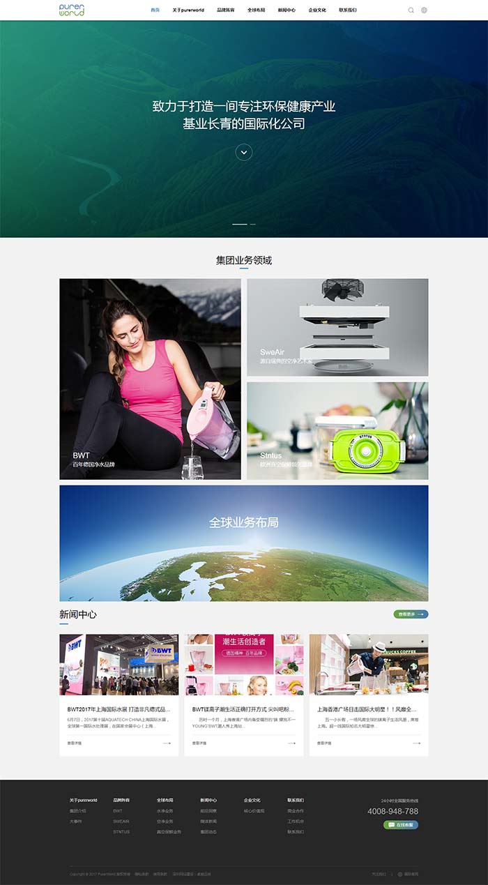 純凈世界集團(tuán)有限公司創(chuàng)立于2013年,是一家集科研、設(shè)計(jì)、生產(chǎn)、銷售、營(yíng)銷于一體的國(guó)際化高科技集團(tuán)企業(yè)。公司實(shí)行多品牌業(yè)務(wù)國(guó)際化發(fā)展策略,旗下有“德國(guó)BWT”、“瑞典世瑞(SweAir)”、“德國(guó)Stntus(鮮途)”三大明星品牌陣容。自創(chuàng)立至今,純凈世界始終致力于人類生活的美好純凈世界,以“純凈世界,健康生活”的創(chuàng)新理念;專業(yè)的品牌、產(chǎn)品和服務(wù),不斷向更廣泛、龐大的水凈、空凈、真空保鮮三大領(lǐng)域發(fā)起挑戰(zhàn)。