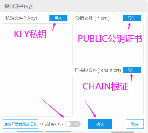 請(qǐng)依次安裝對(duì)應(yīng)的證書。安裝好后,請(qǐng)開啟HTTPS按鈕。然后點(diǎn)“確認(rèn)”。