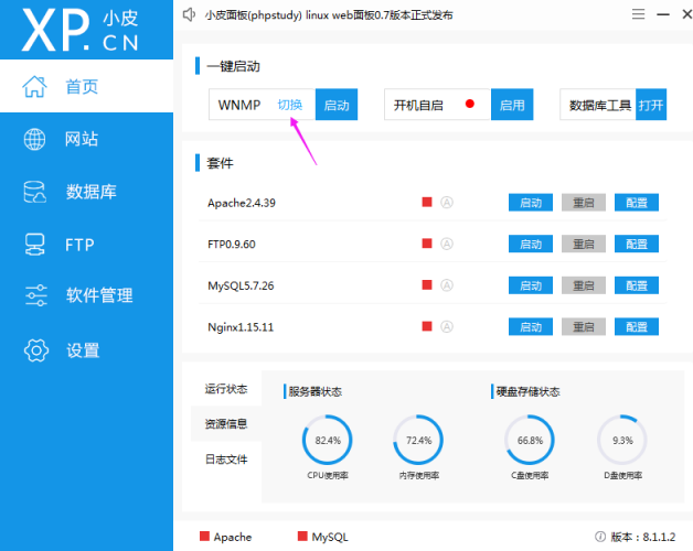 1)啟動(dòng)Apache及Mysql,如圖點(diǎn)“切換”