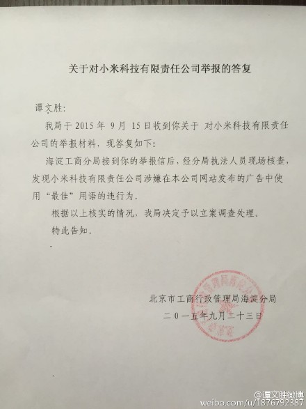 在新廣告法頒布的第二天,譚文勝向北京市工商局實名舉報小米手機涉嫌虛假宣傳,稱小米產(chǎn)品在宣傳中使用的“最新”、“最低”等違反了新廣告法的規(guī)定。但對于此次舉報,北京市工商局表示“小米產(chǎn)品宣傳合乎規(guī)范,不構成針對新《廣告法》的違法事實”。譚文勝隨后對裁定結果提出質疑:工商局的裁定結果通過電話反饋給舉報是否妥當,同時裁定結果是否應該以書面文字形式進行回復,以便于其自己品牌在宣傳時有據(jù)可依。
